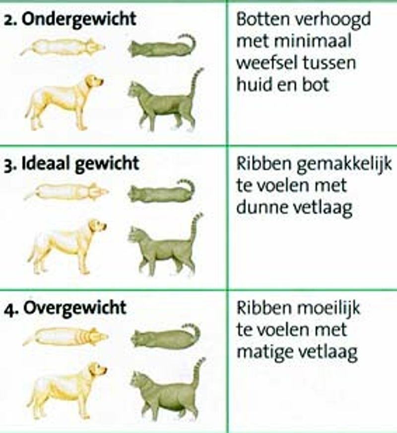 De lichaamsconditiescore geeft aan of uw huisdier een ideaal gewicht heeft of erboven zit. Met behulp van onderstaande schema’s kunt u zien of uw kat een optimale lichaamsconditiescore heeft. Twijfelt u of uw kat overgewicht heeft ? Ga voor de zekerheid even langs de dierenarts.